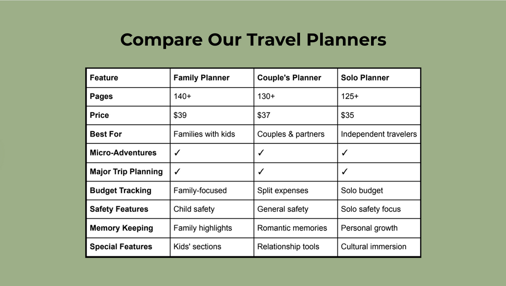trips, the Couple's planner for romantic getaways, and the Solo planner for independent